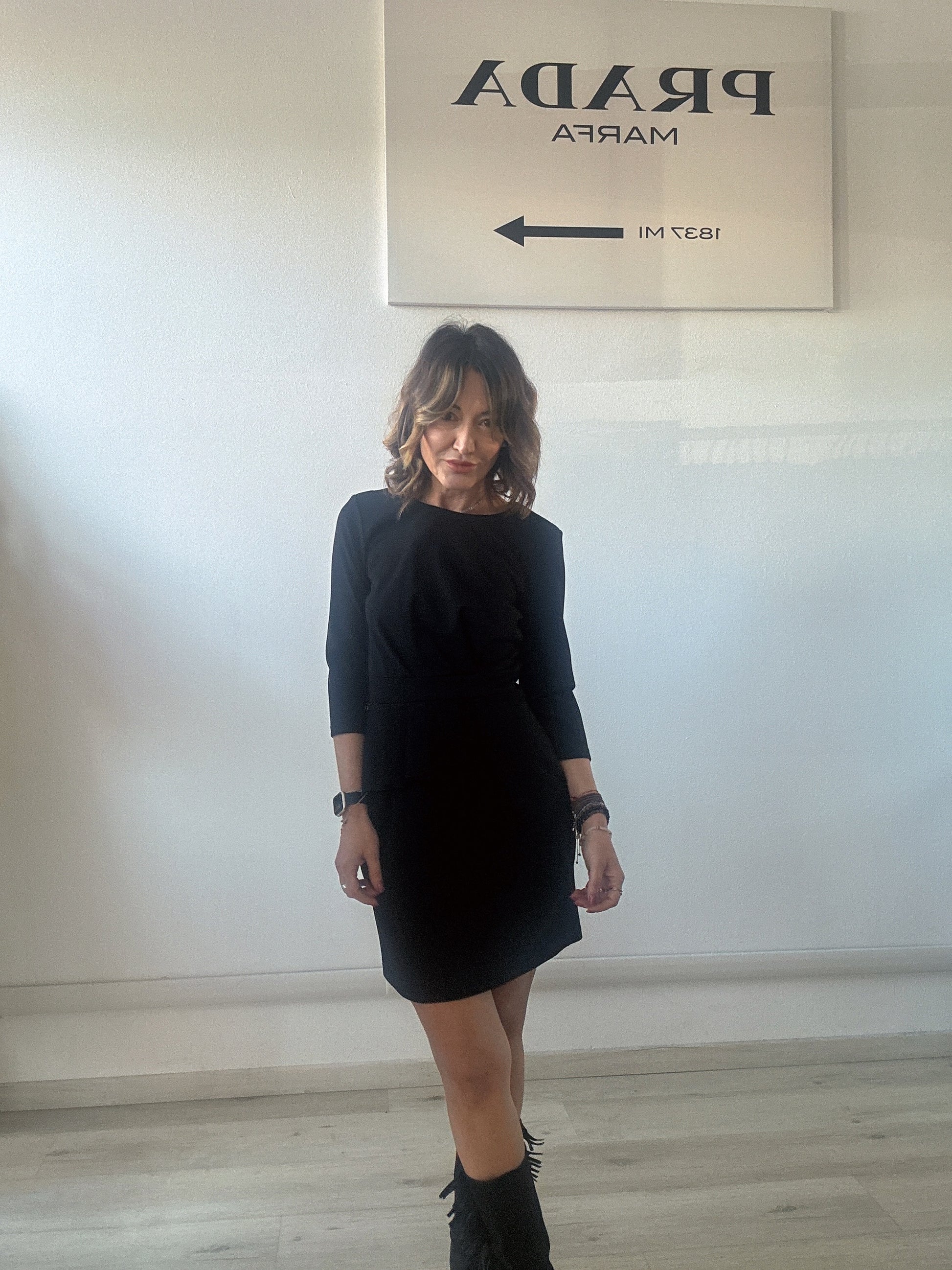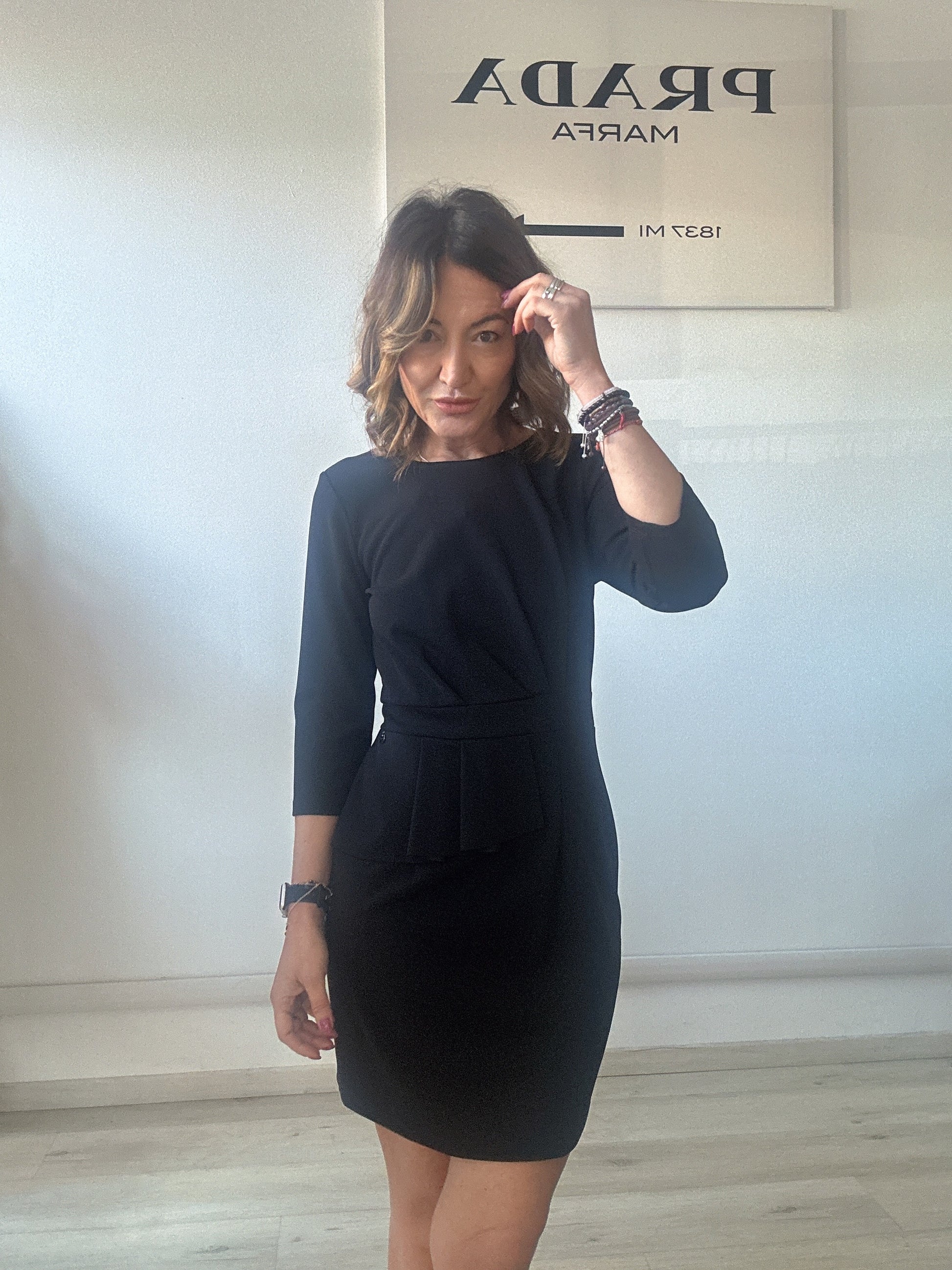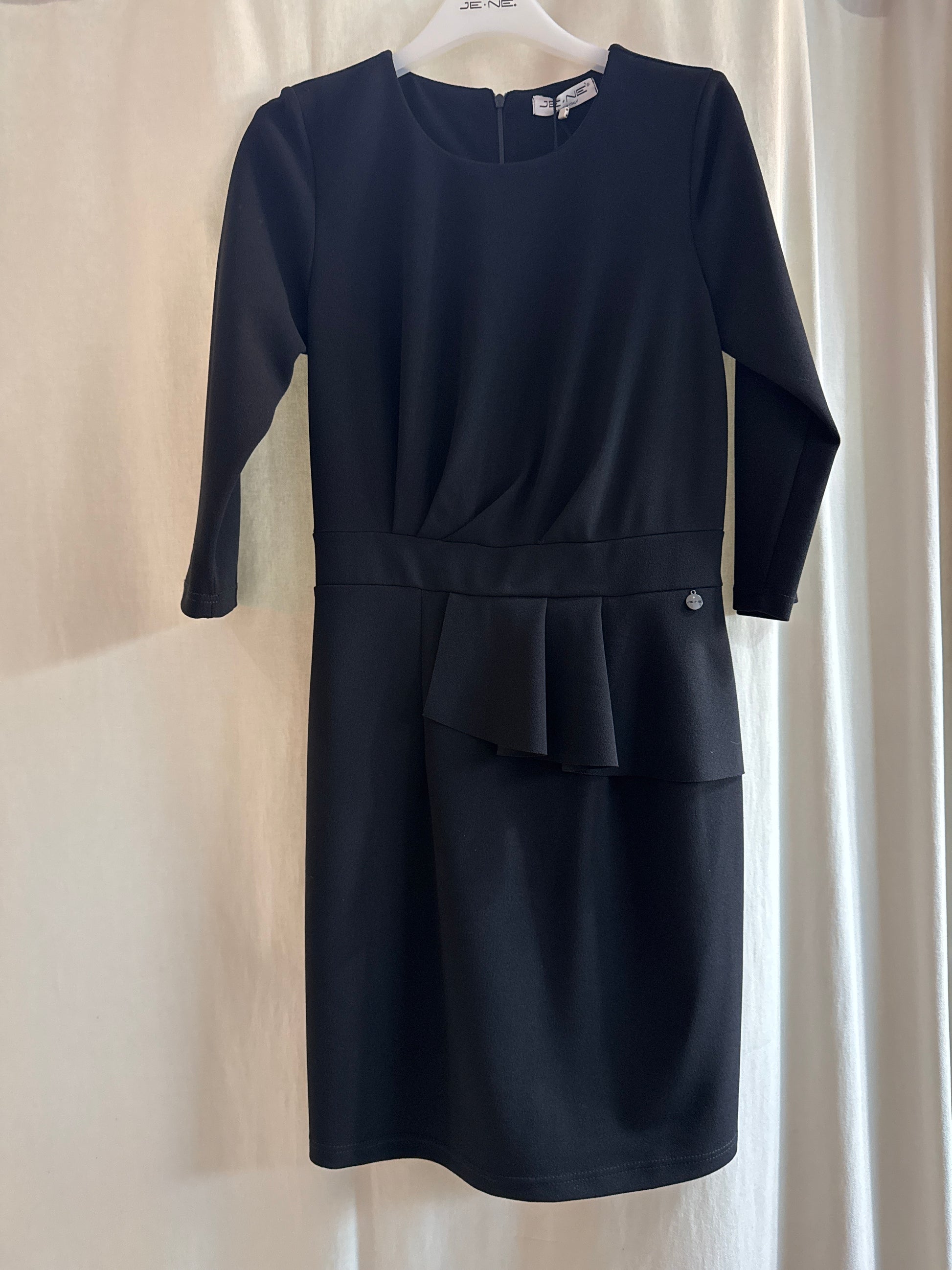 Abito a tubino con balza anteriore e zip posteriore, manica a tre quarti