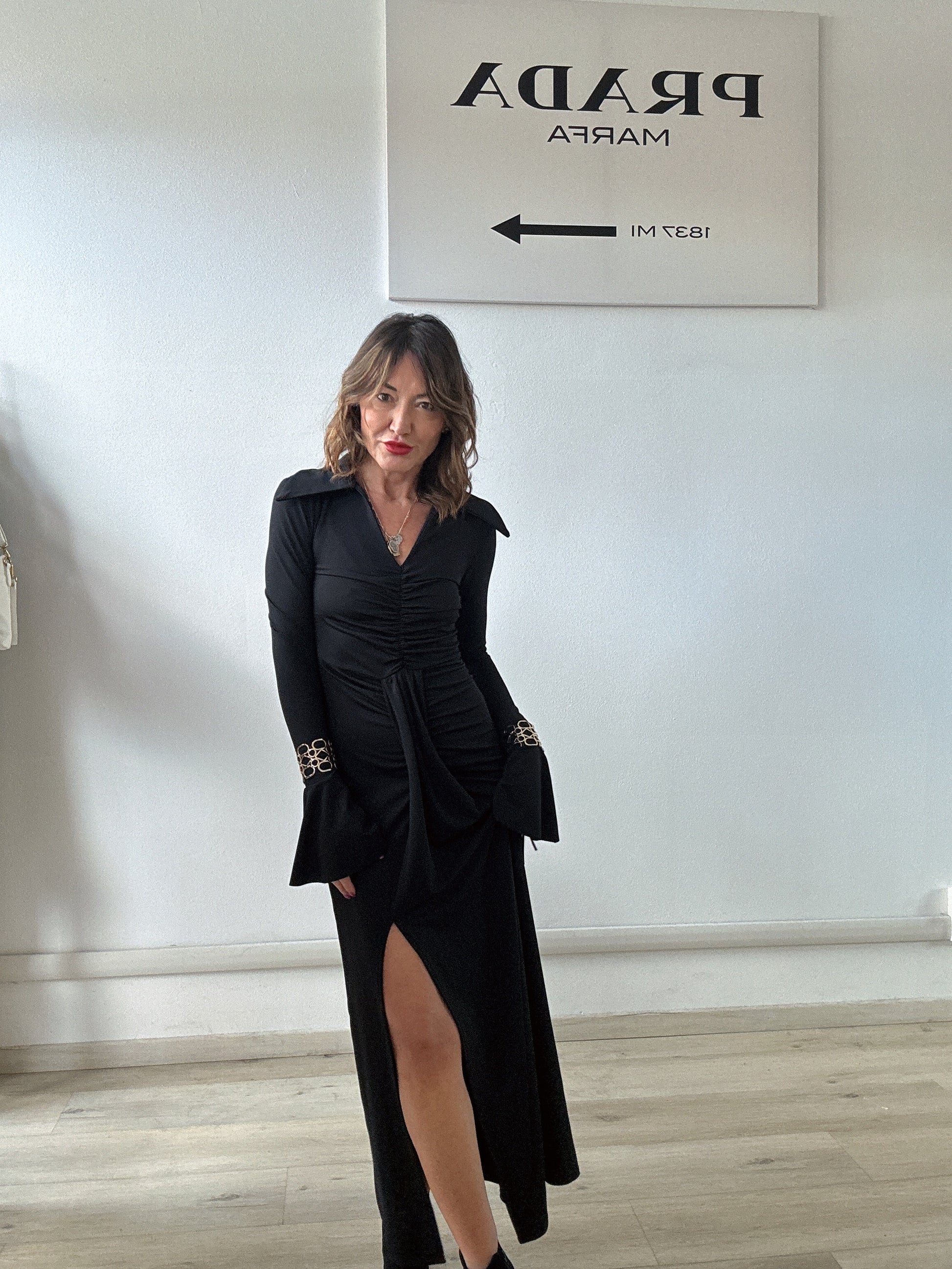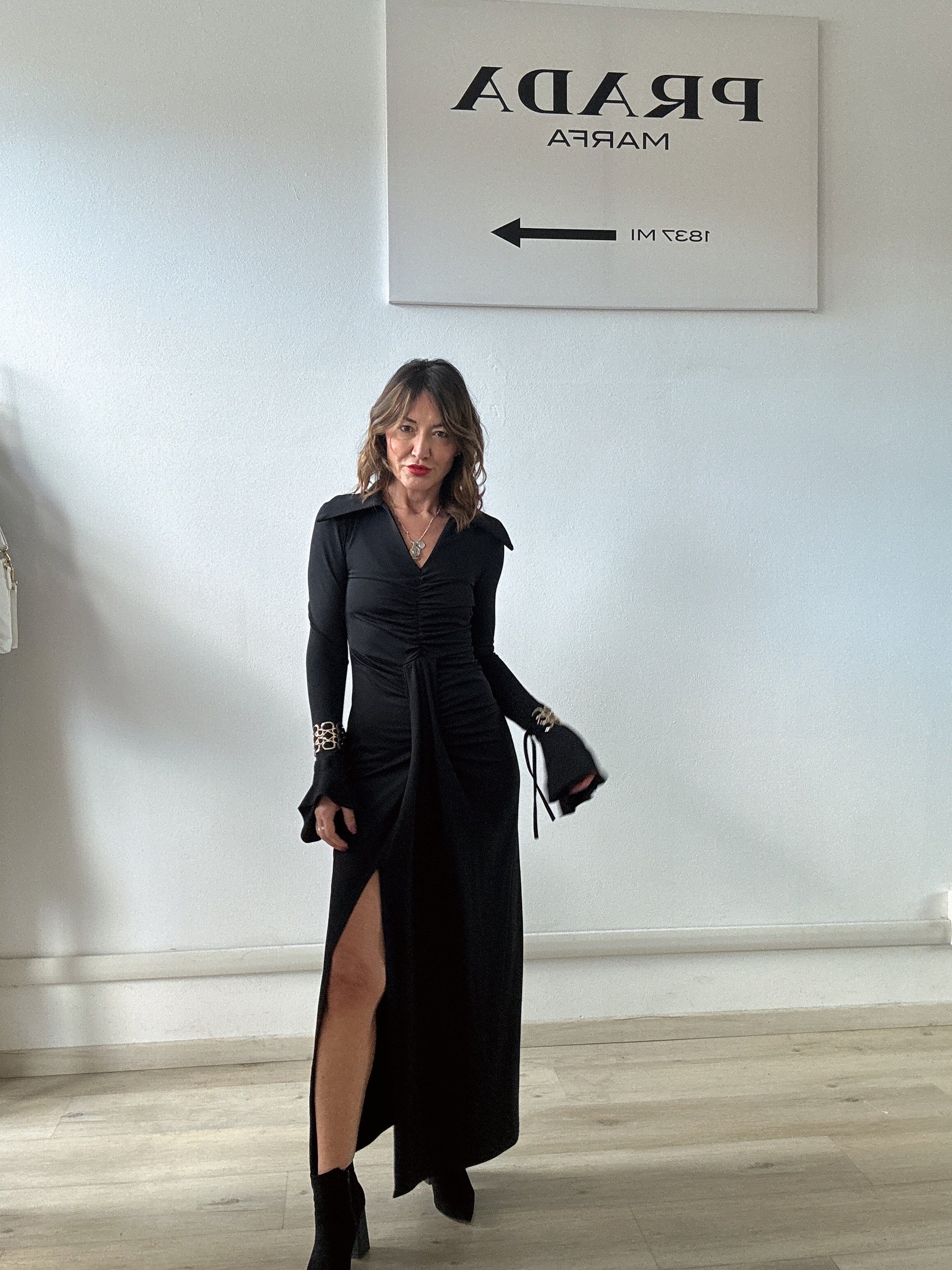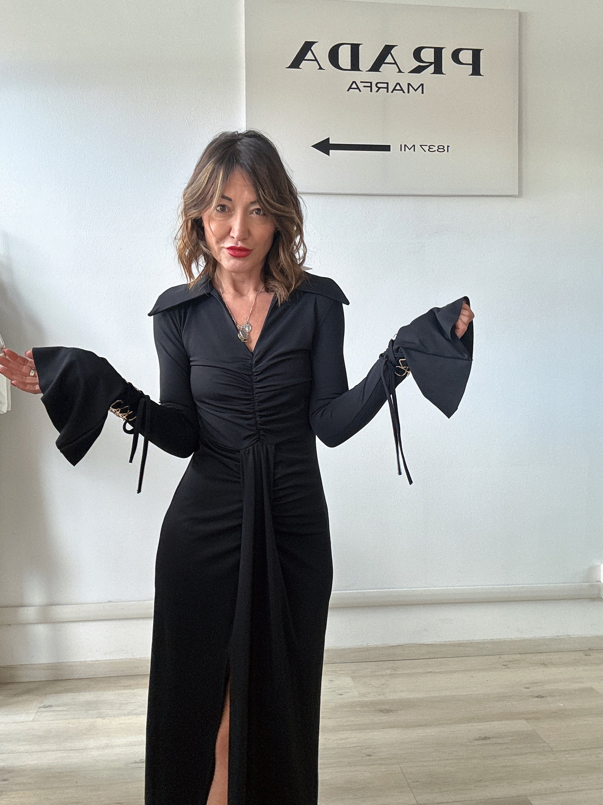 Abito a tubino con scollo camicia, drappeggio anteriore e spacco