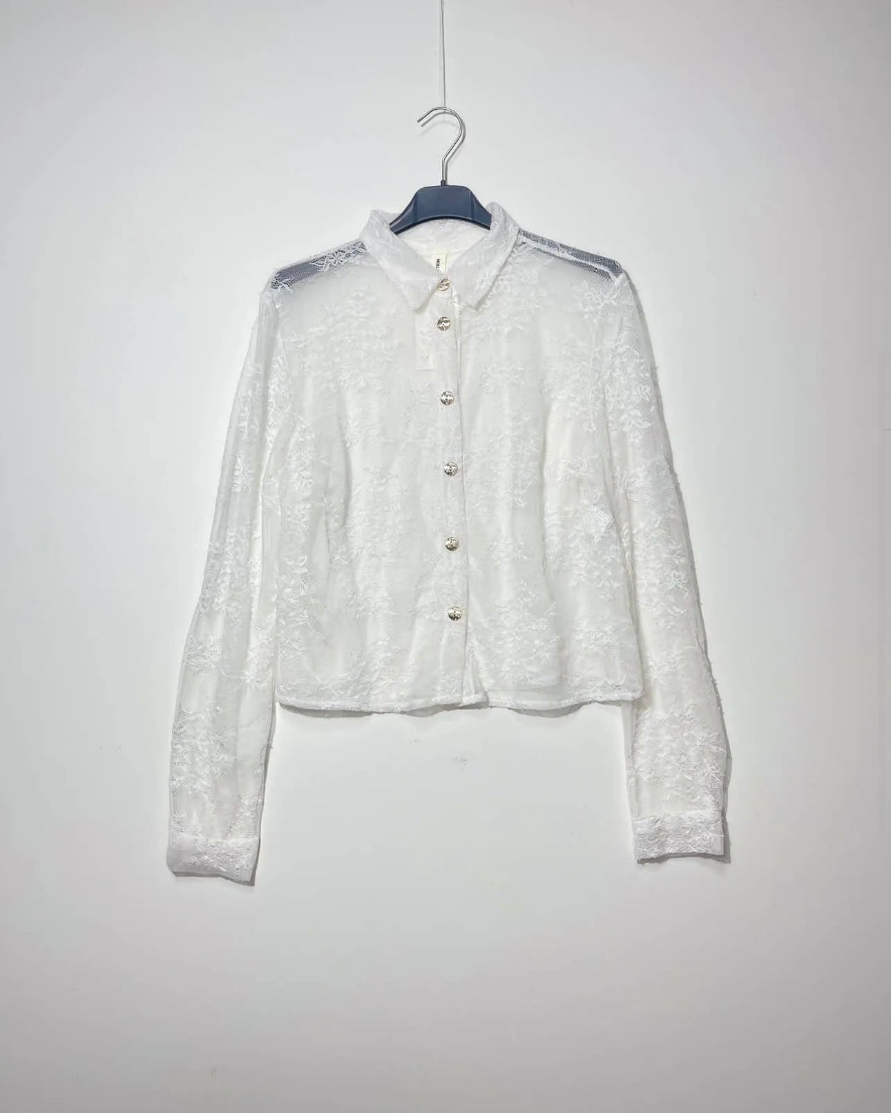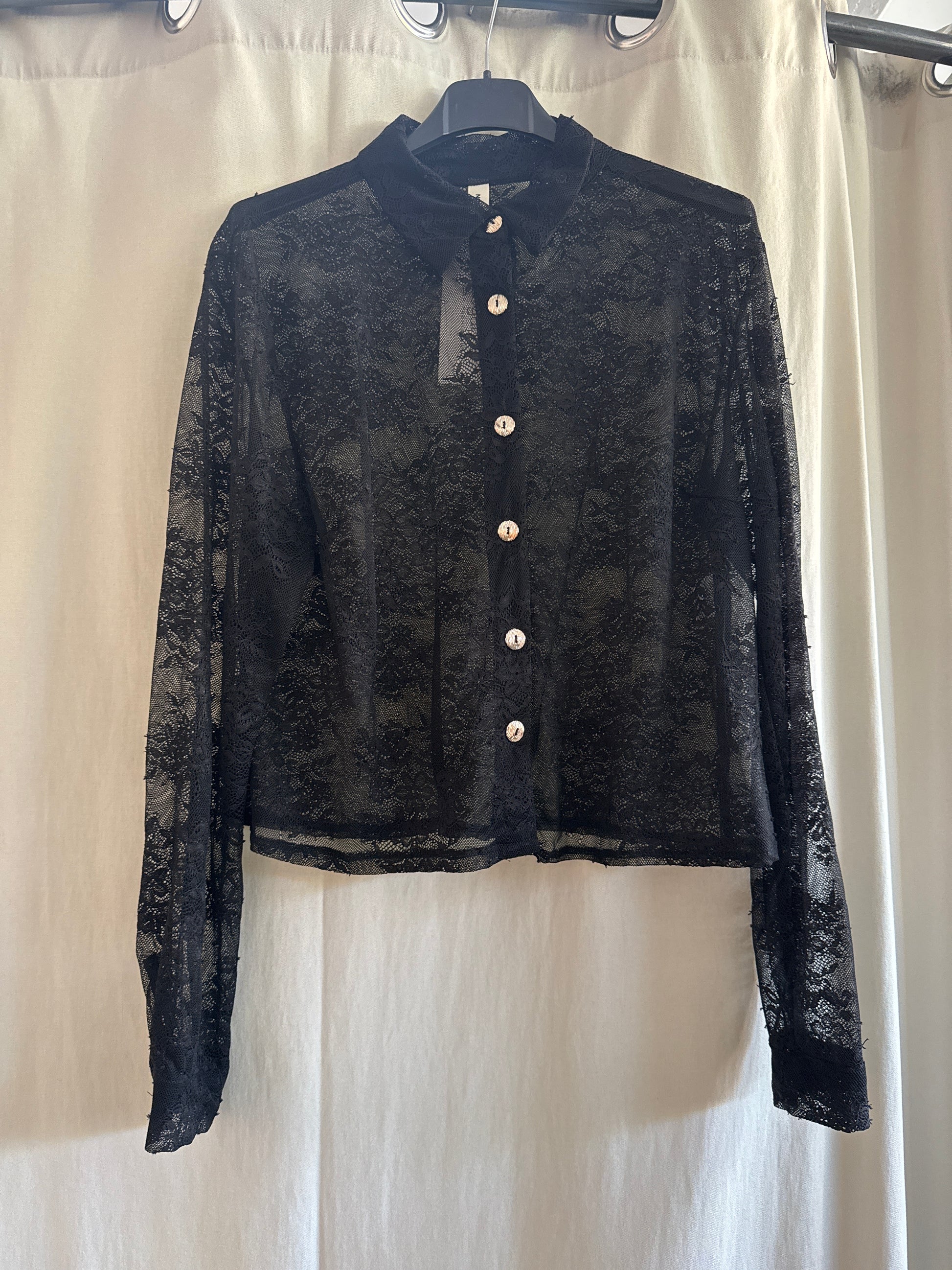 Camicetta cropped in pizzo trasparente con bottoni gioiello