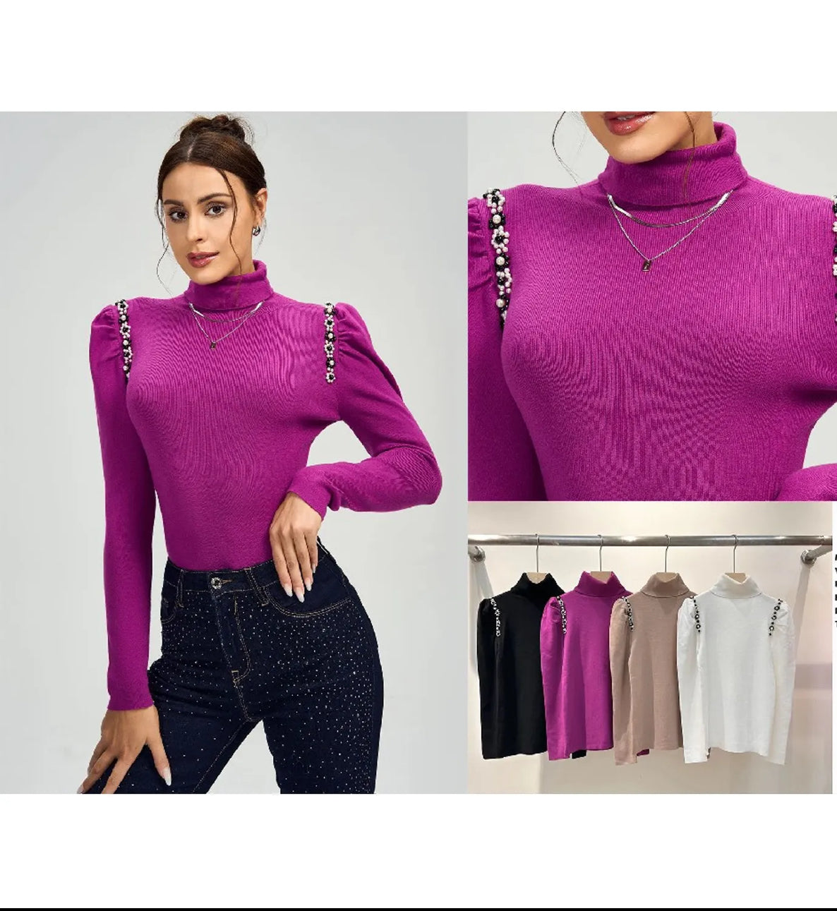 Maglia dolcevita in viscosa con spalla a sbuffo e perline applicate
