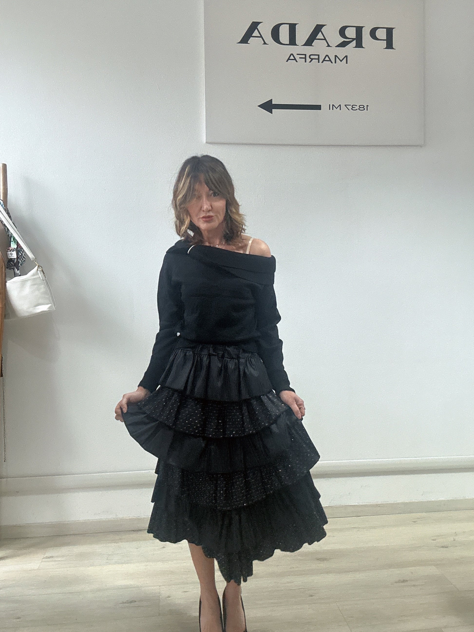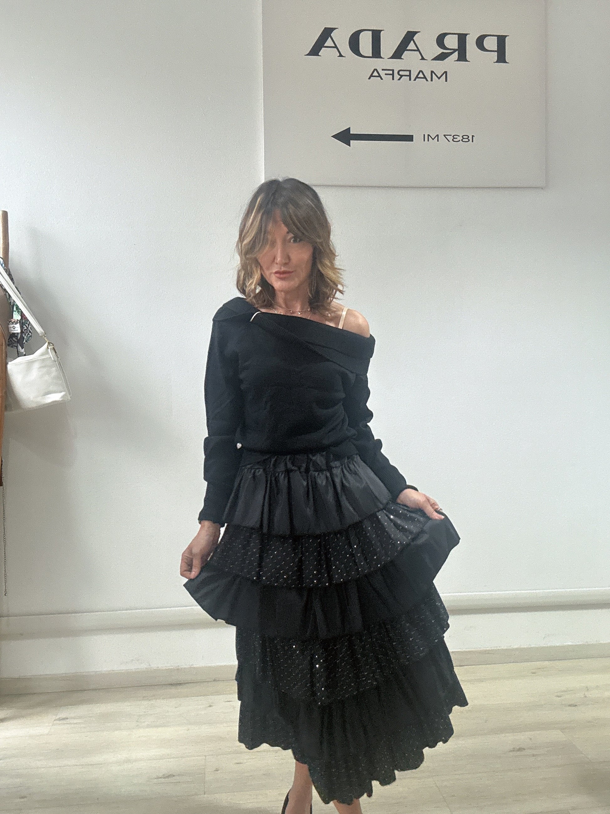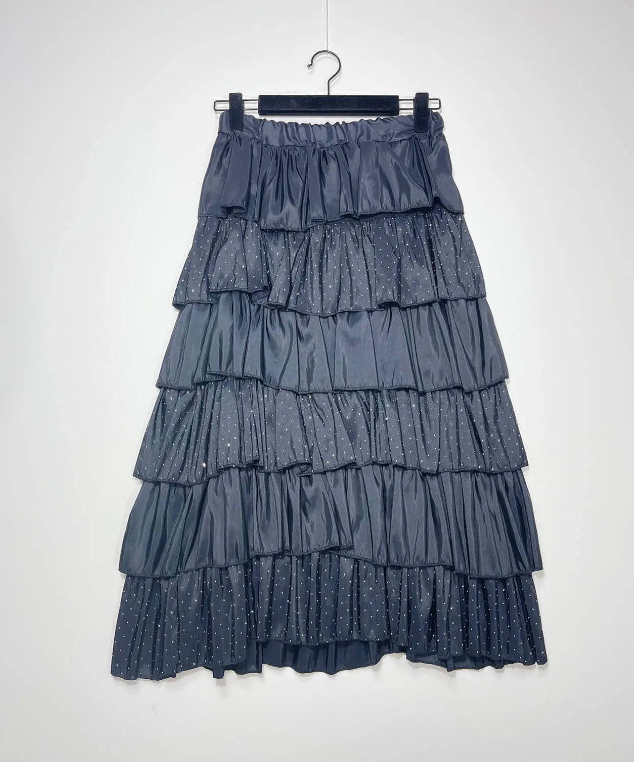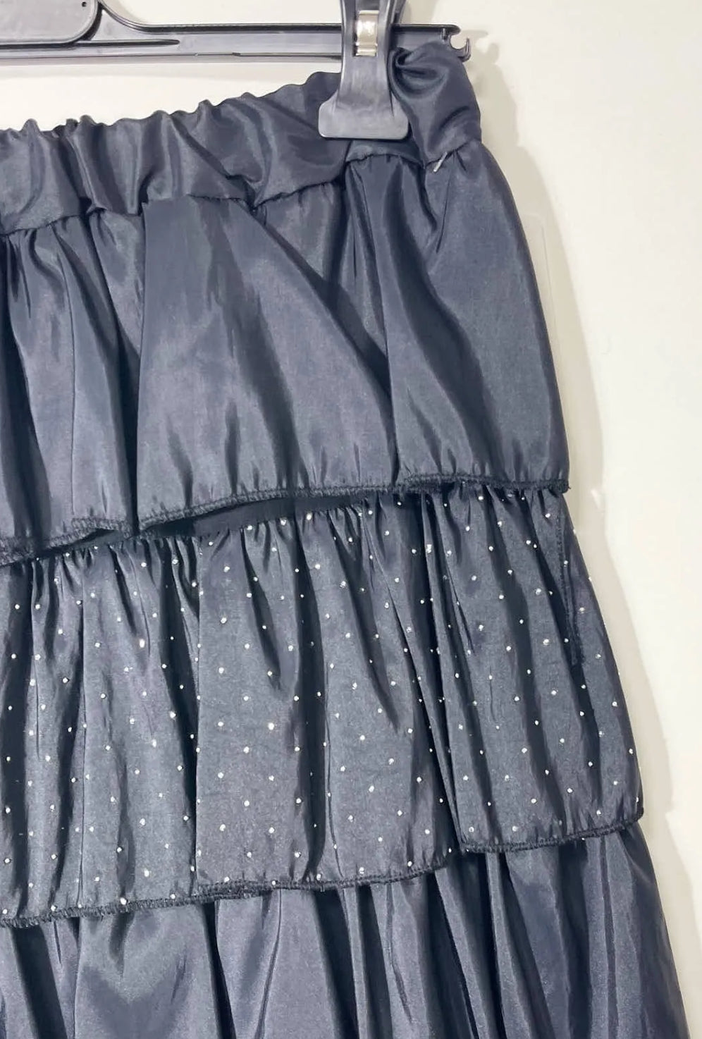 Gonna lunga a balze in taffeta con brillantini e elastico in vita
