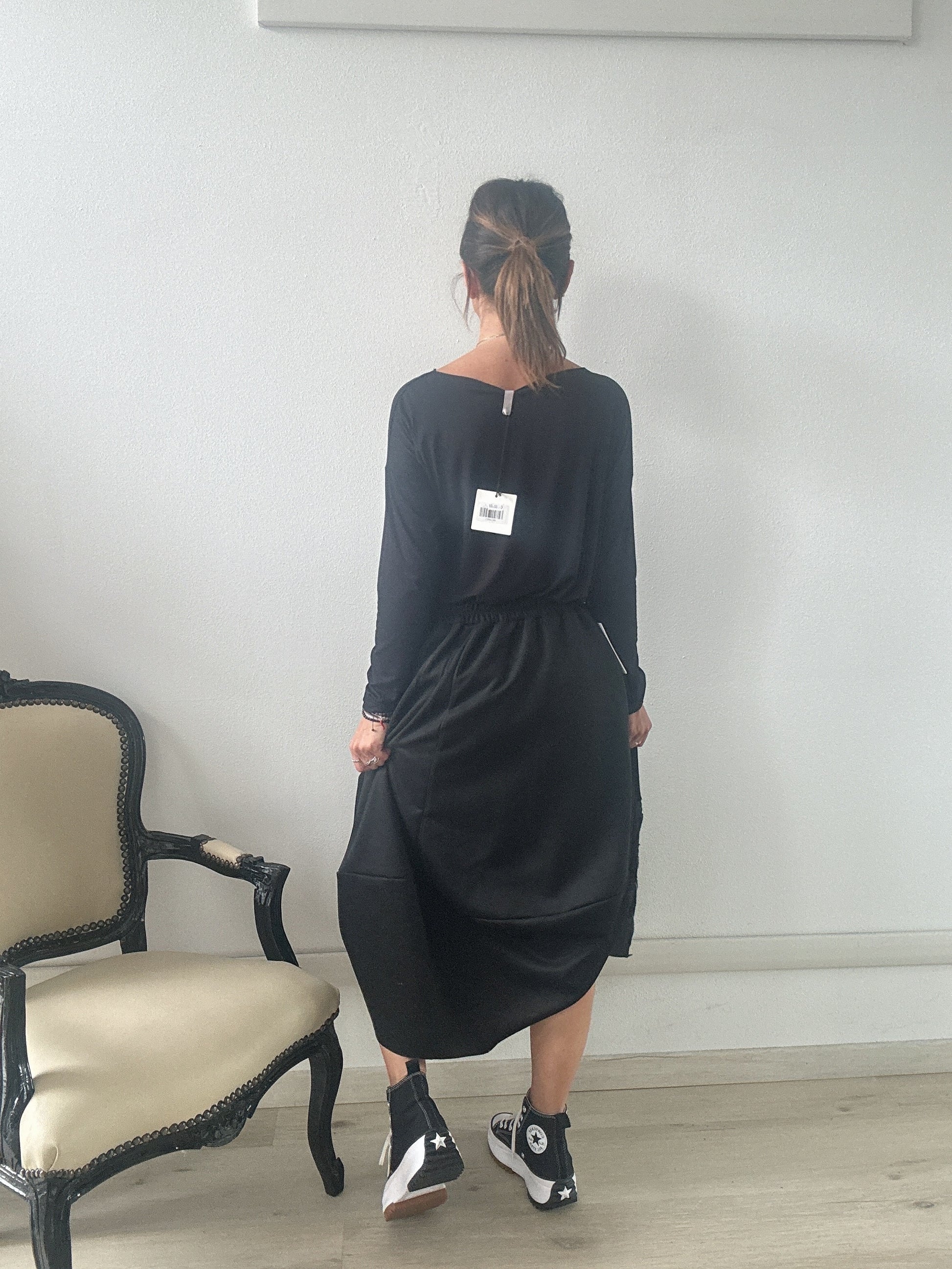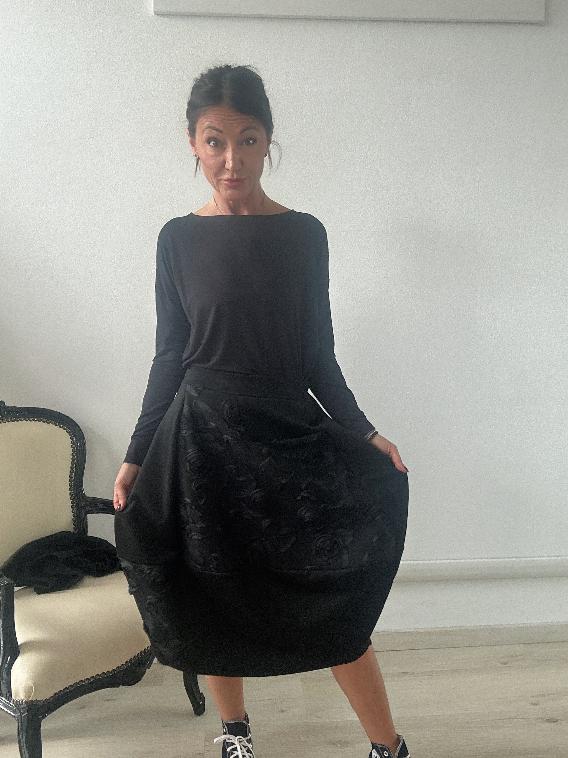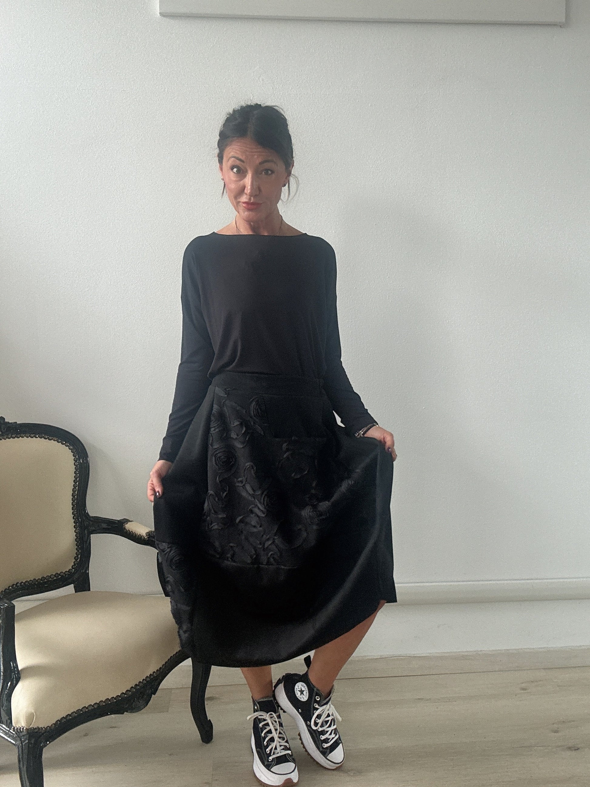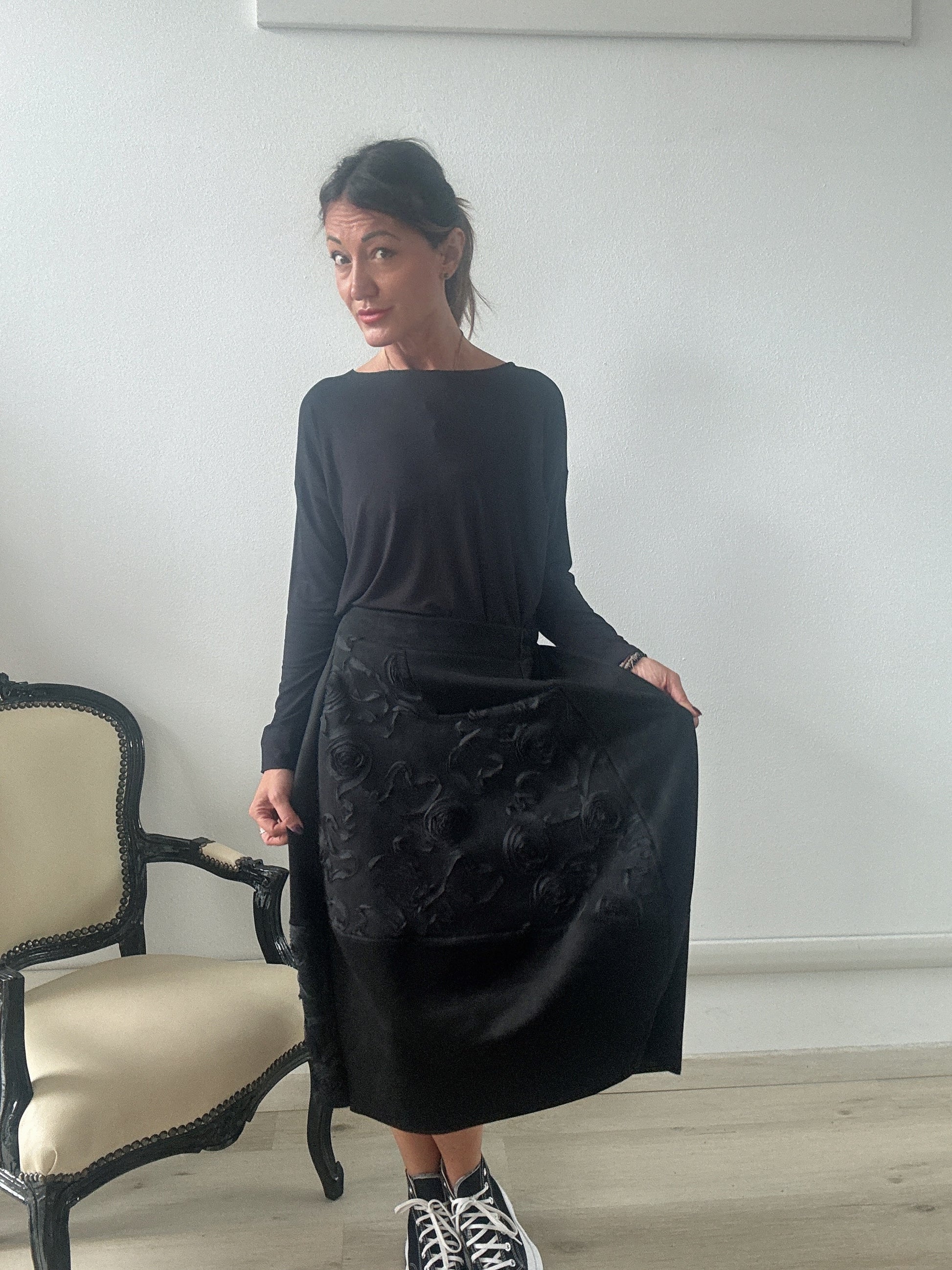 Gonna con ricami in eco suede, forma ad ovetto ed elastico in vita