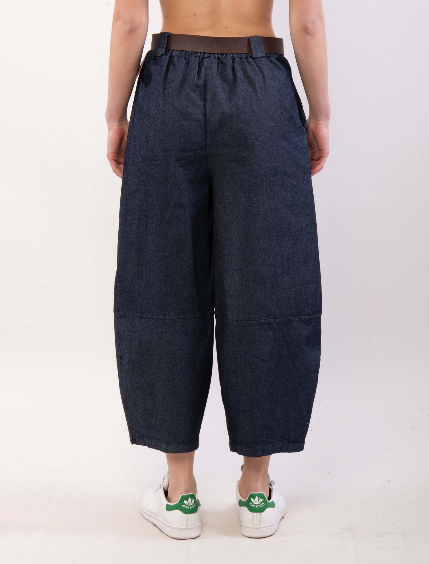 Jeans in chambray ad ovetto con pinces frontali, elastico in vita e cintura. Tasche laterali