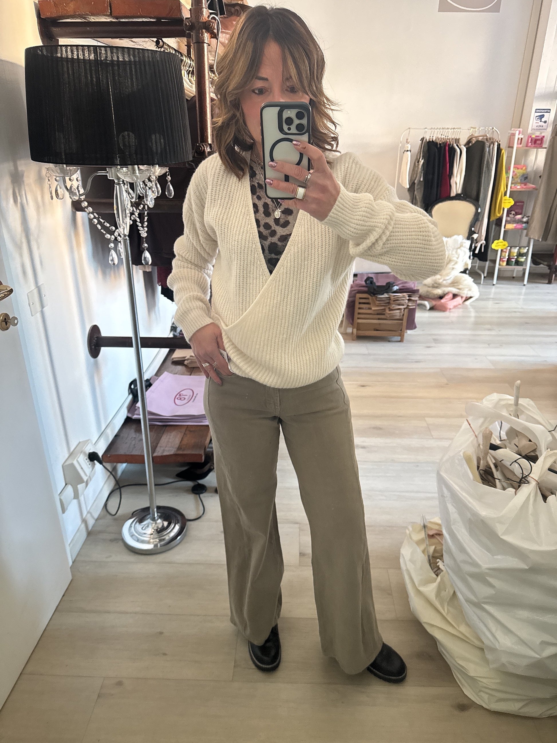 Jeans leggero elasticizzato a zampa a vita medio alta, color tortora