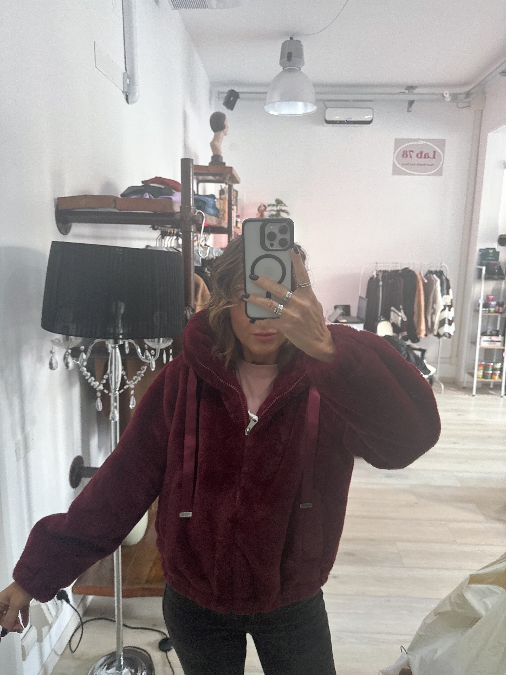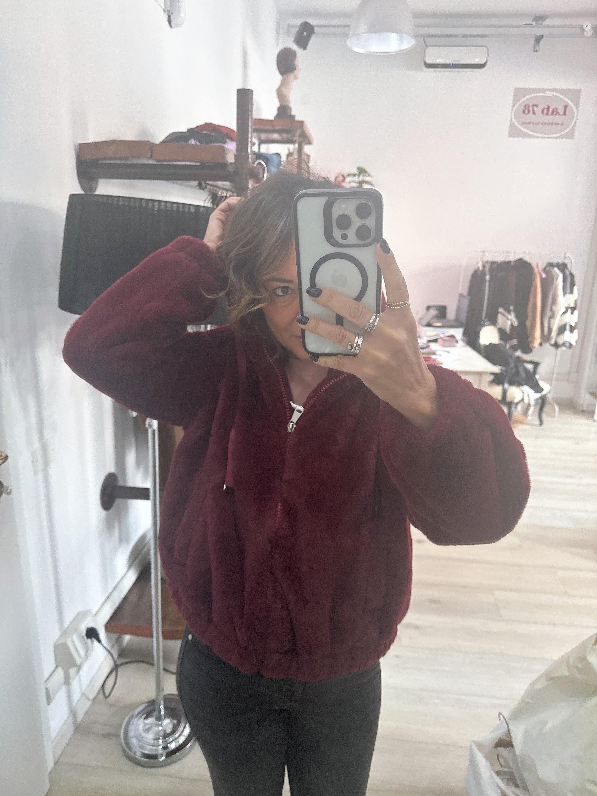 Eco pellicciotto con fodera in raso, zip e cappuccio