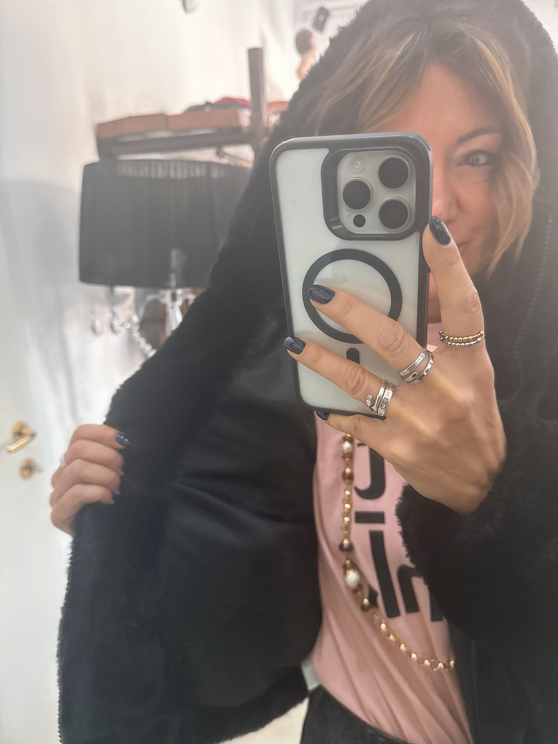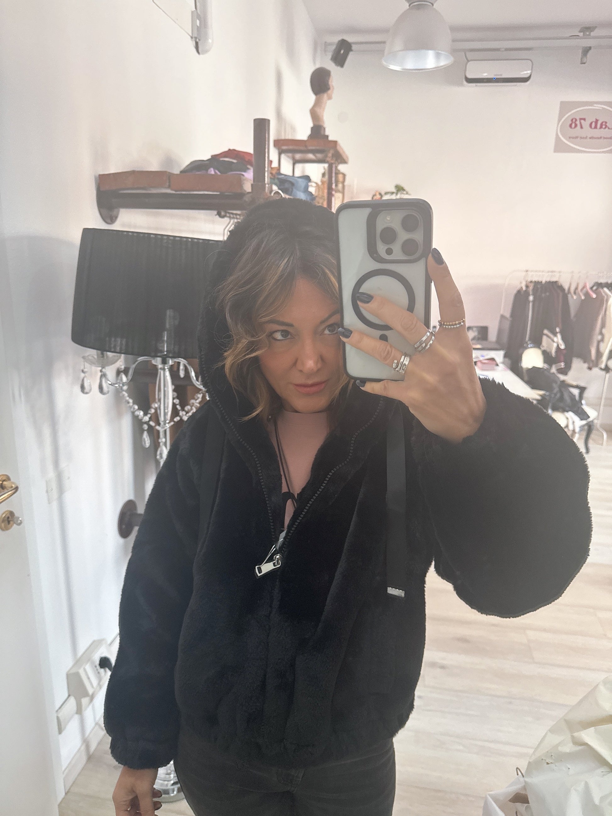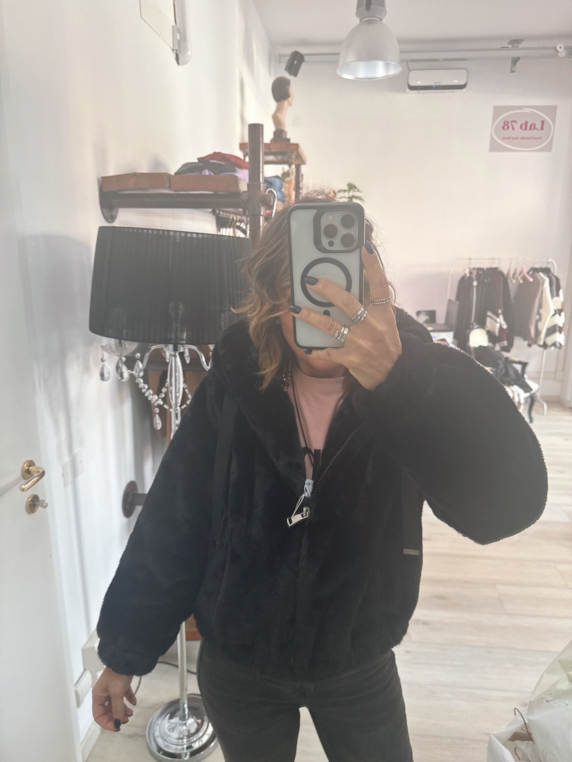 Eco pellicciotto a bomber con zip e cappuccio e fodera interna in raso
