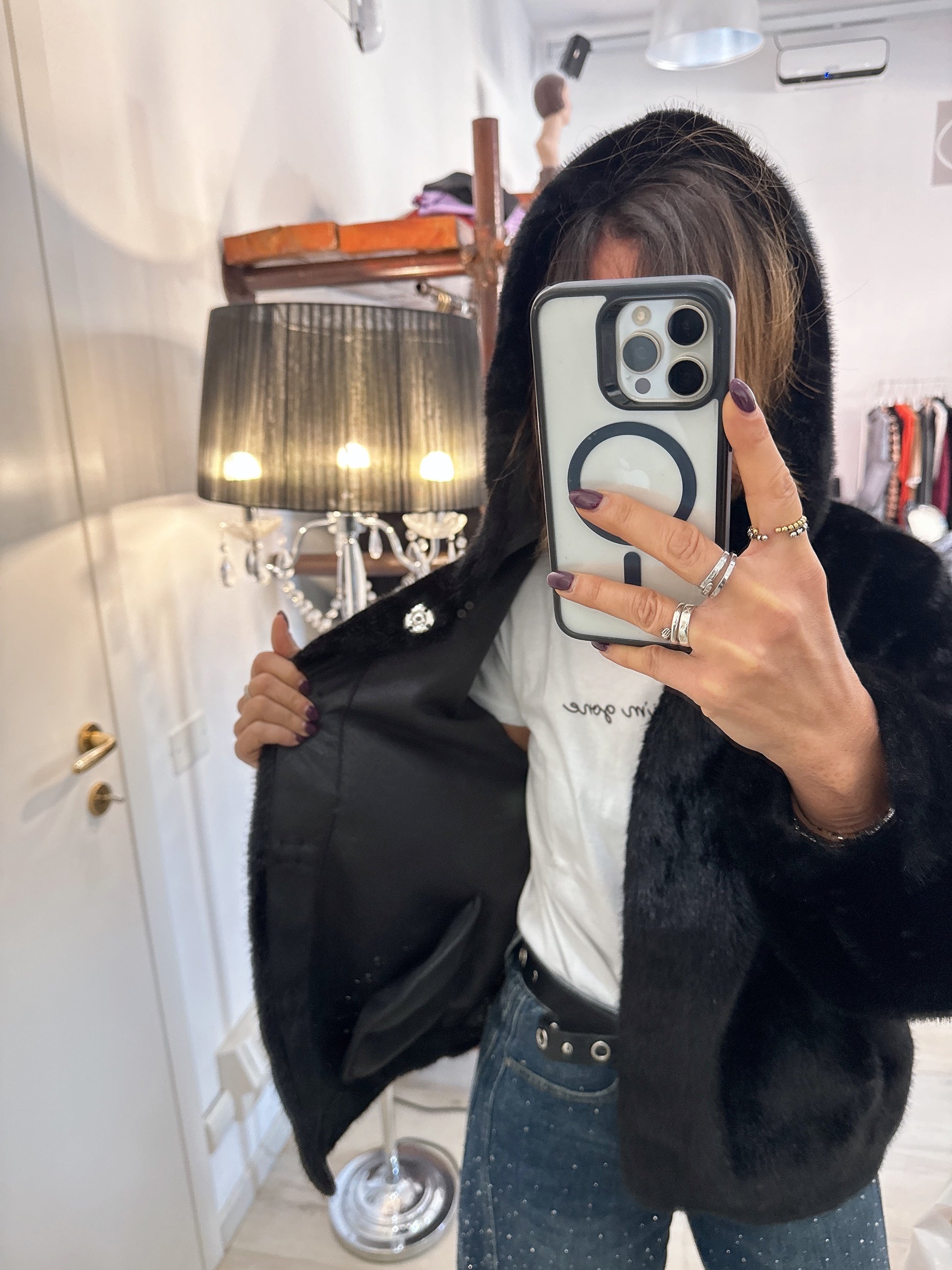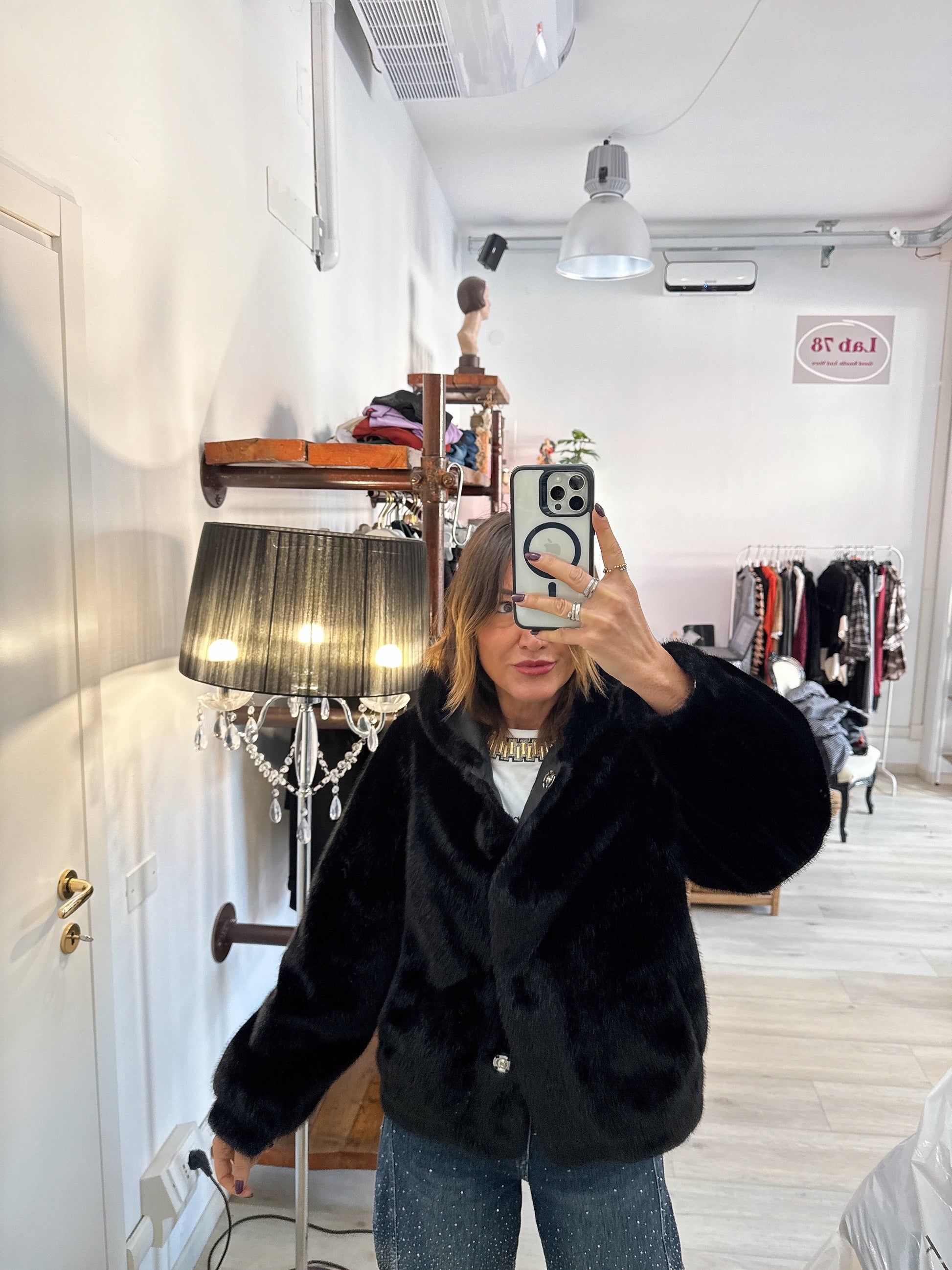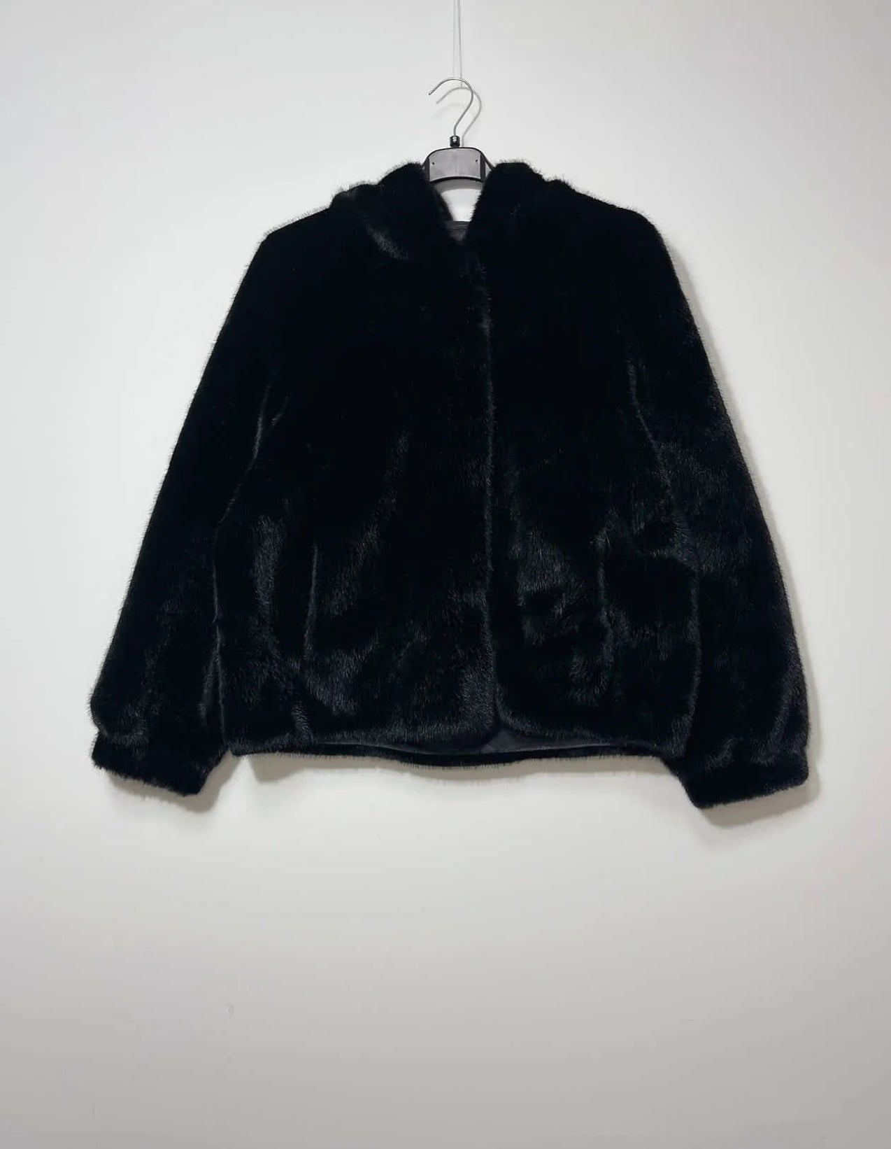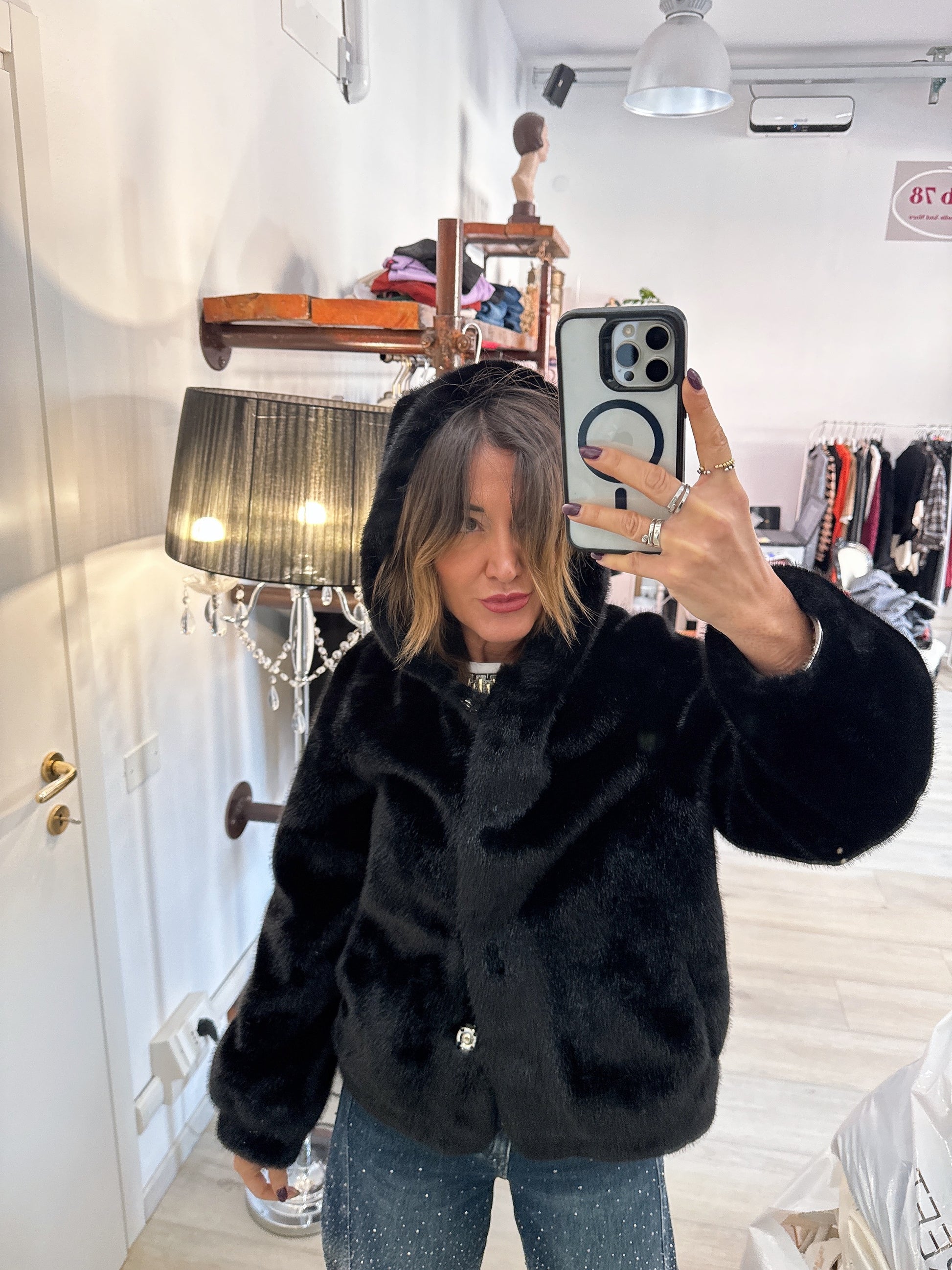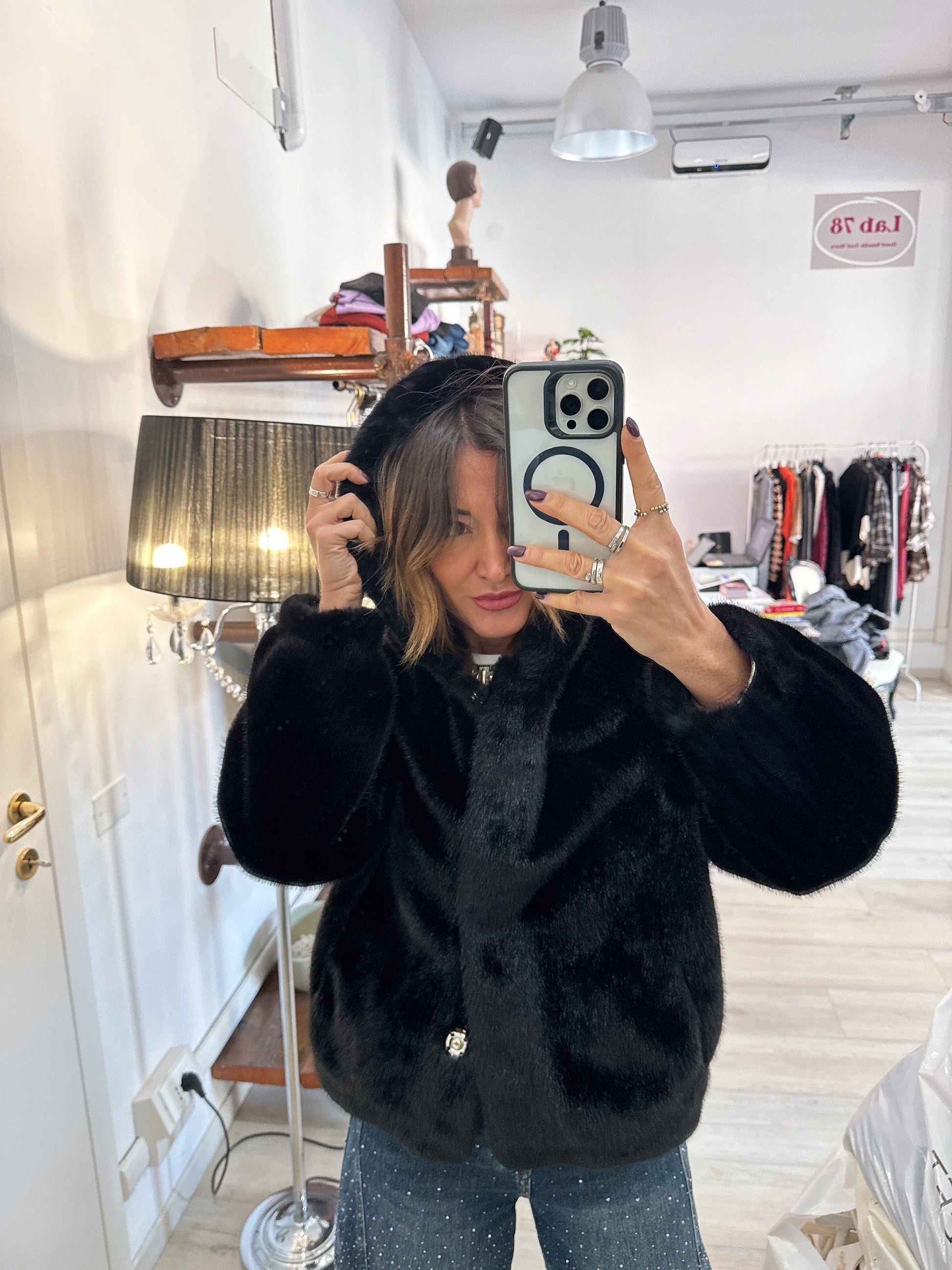 Eco pelliccia con cappuccio e chiusura con bottoni a pressione
