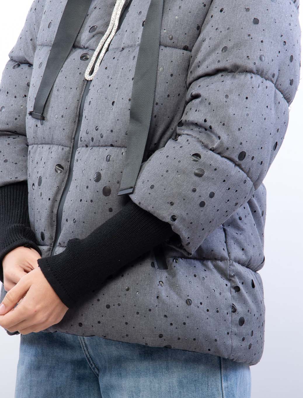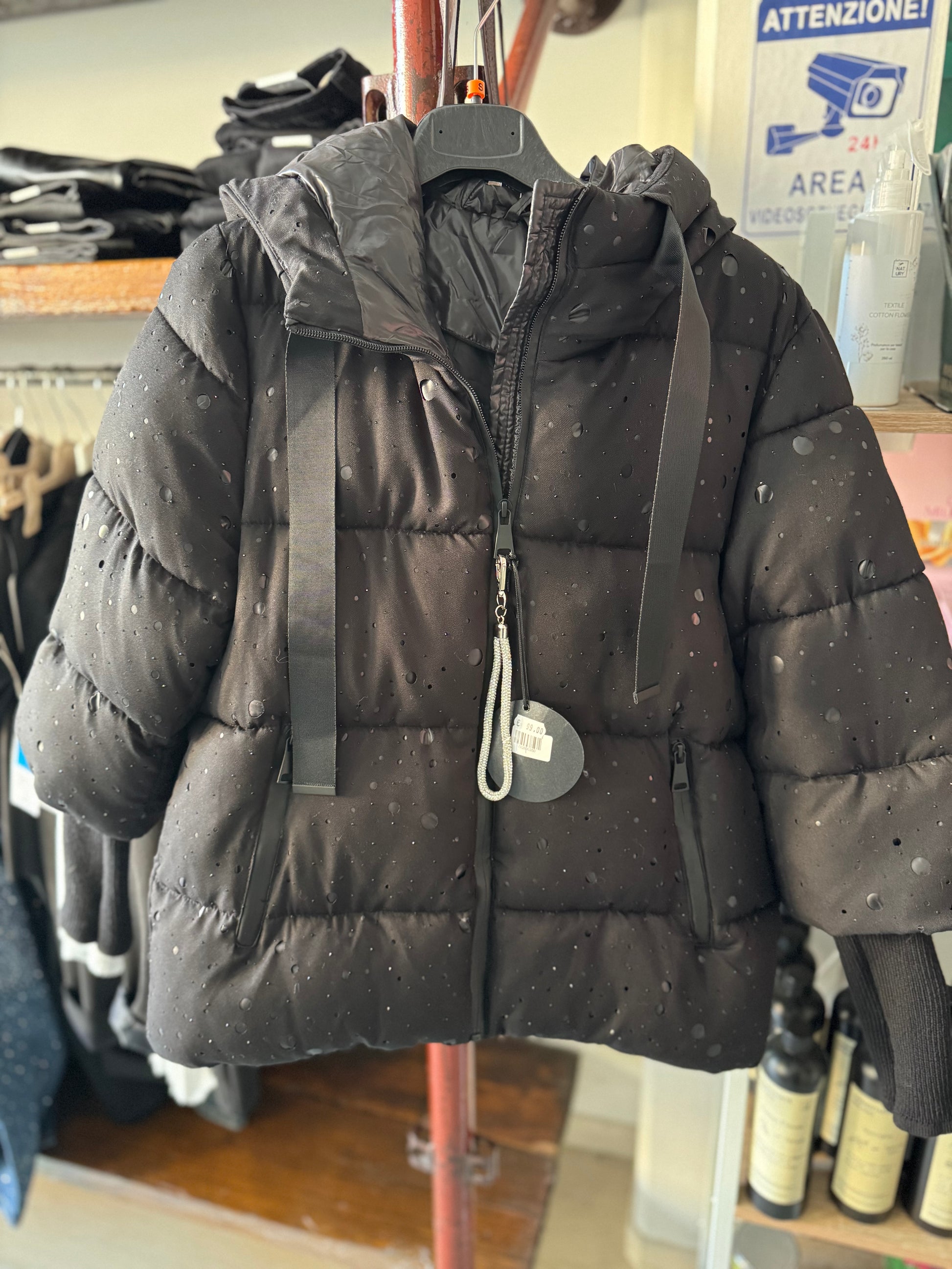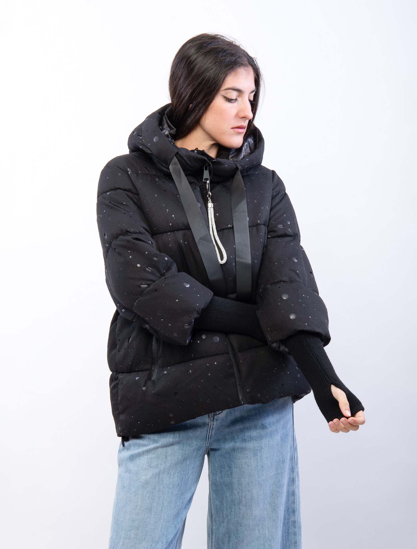 Piumino con cappuccio, coulisse in vita e polsini in maglia