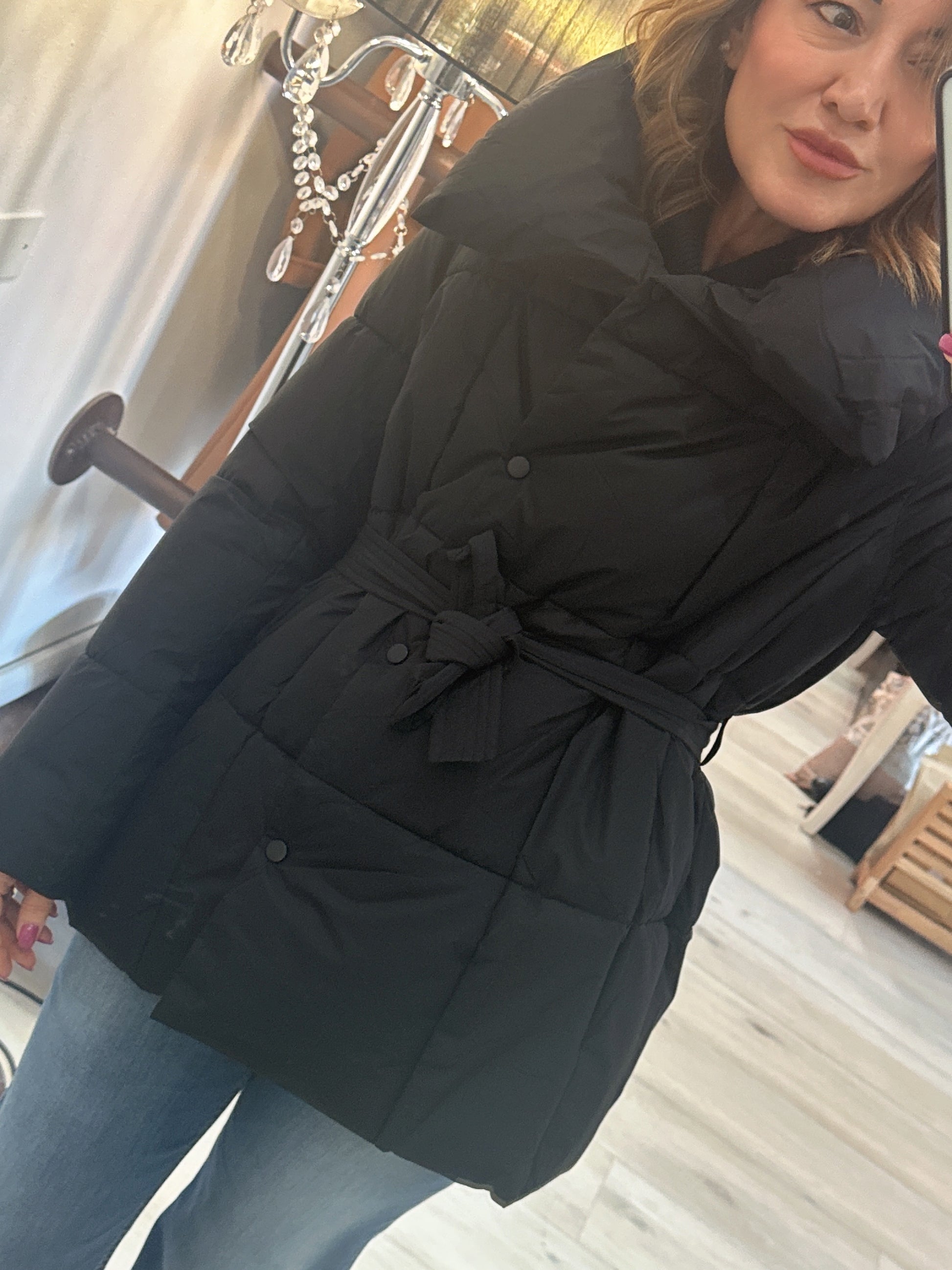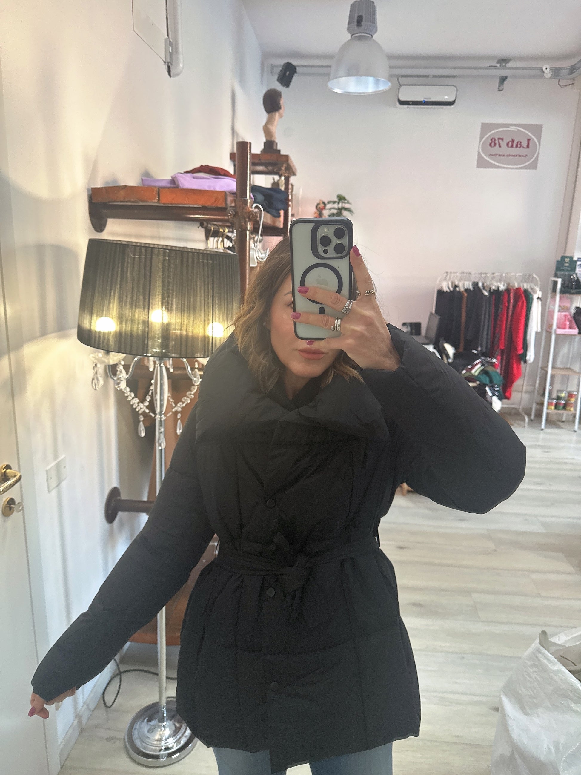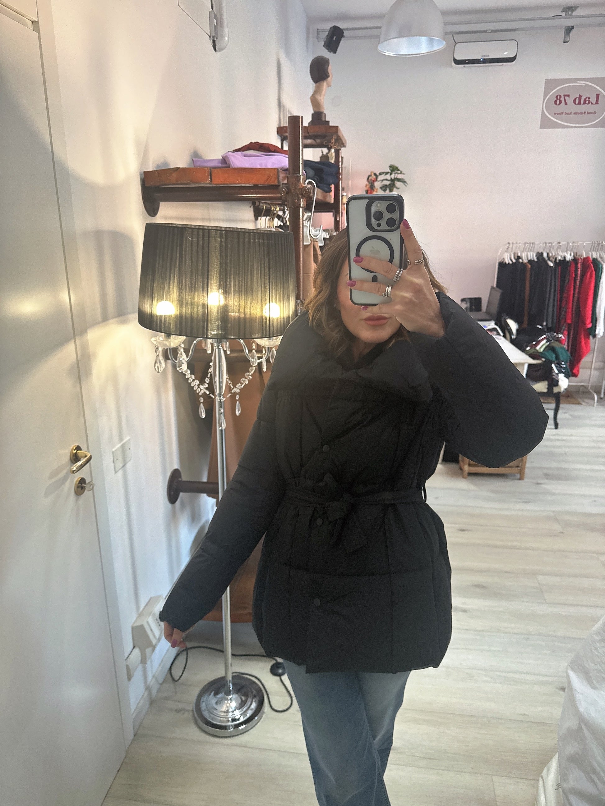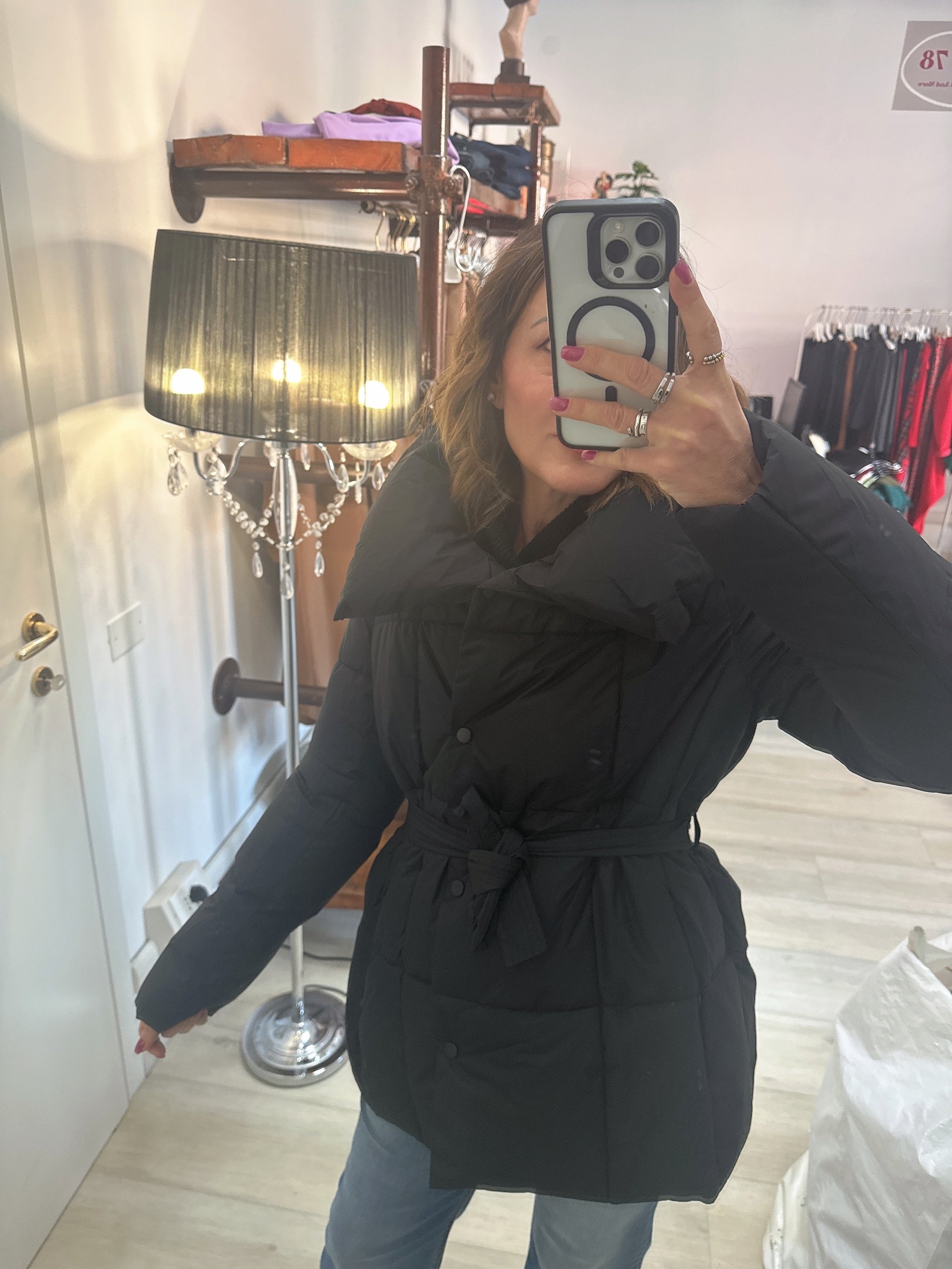 Piumino con chiusura a bottoni doppiopetto e cintura in vita