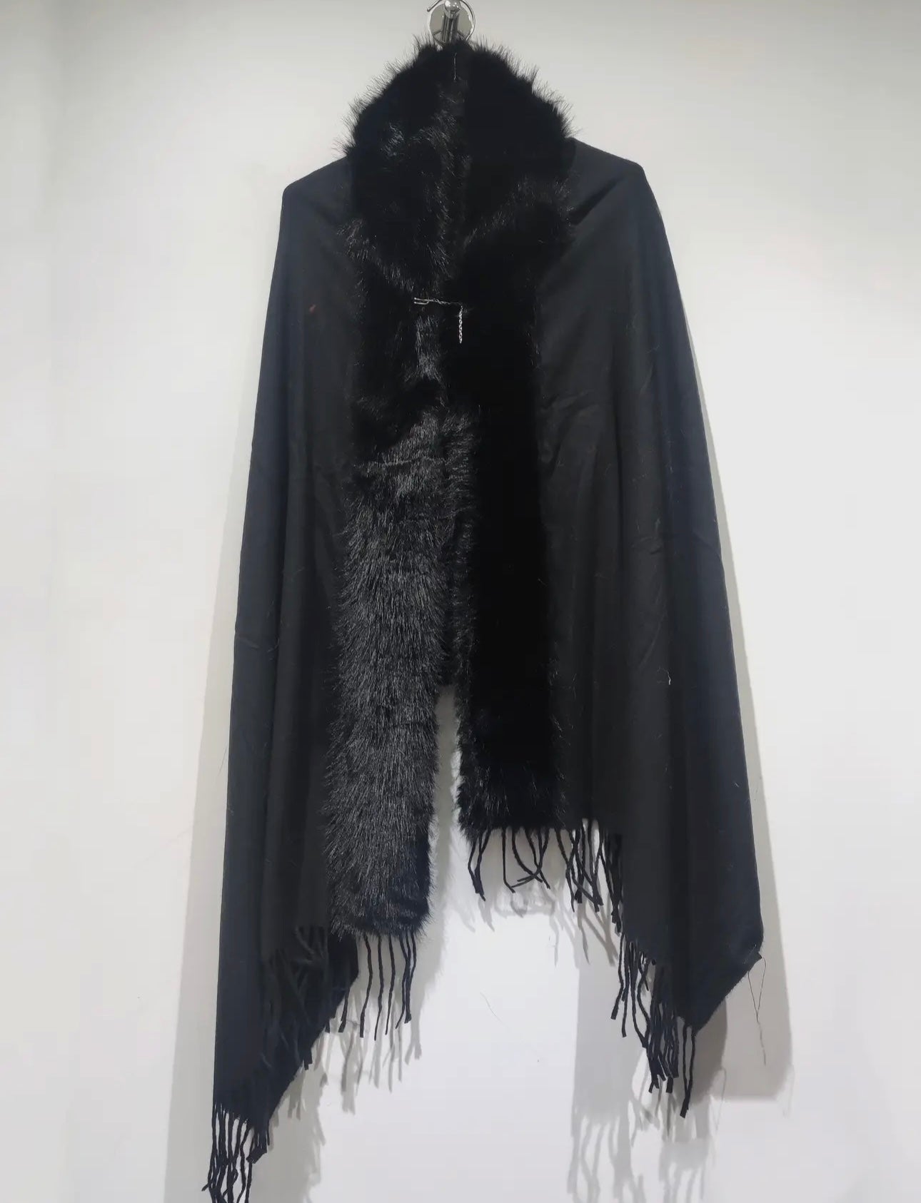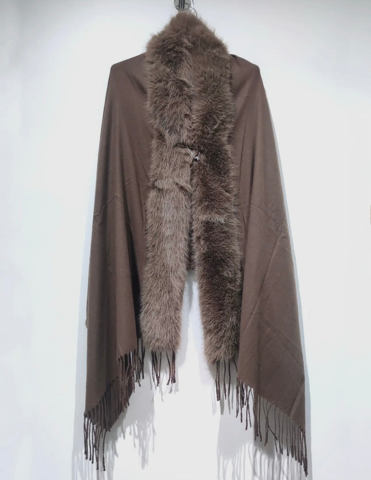Sciarpa in misto lana con profilo in pelliccia e spilla
