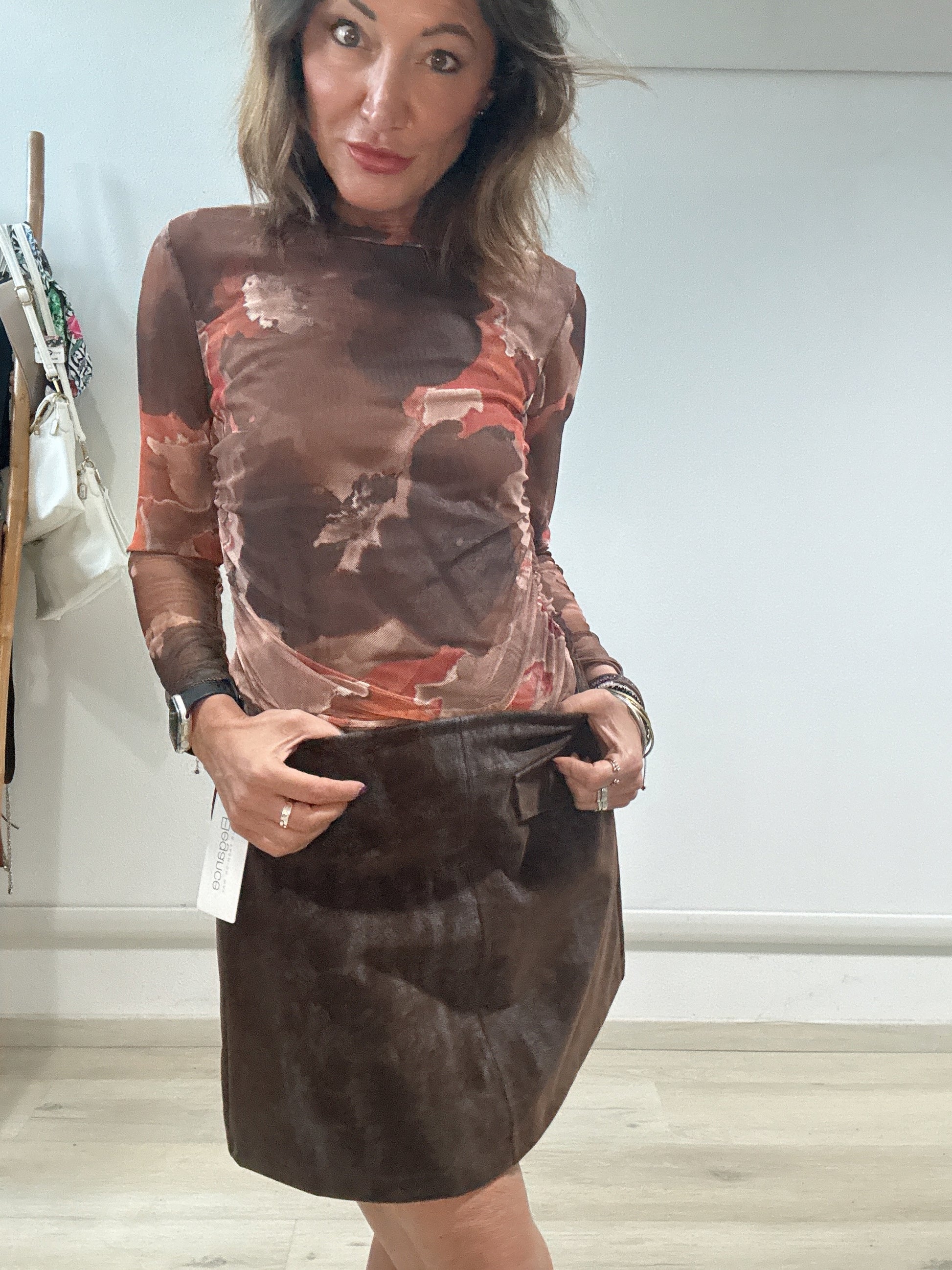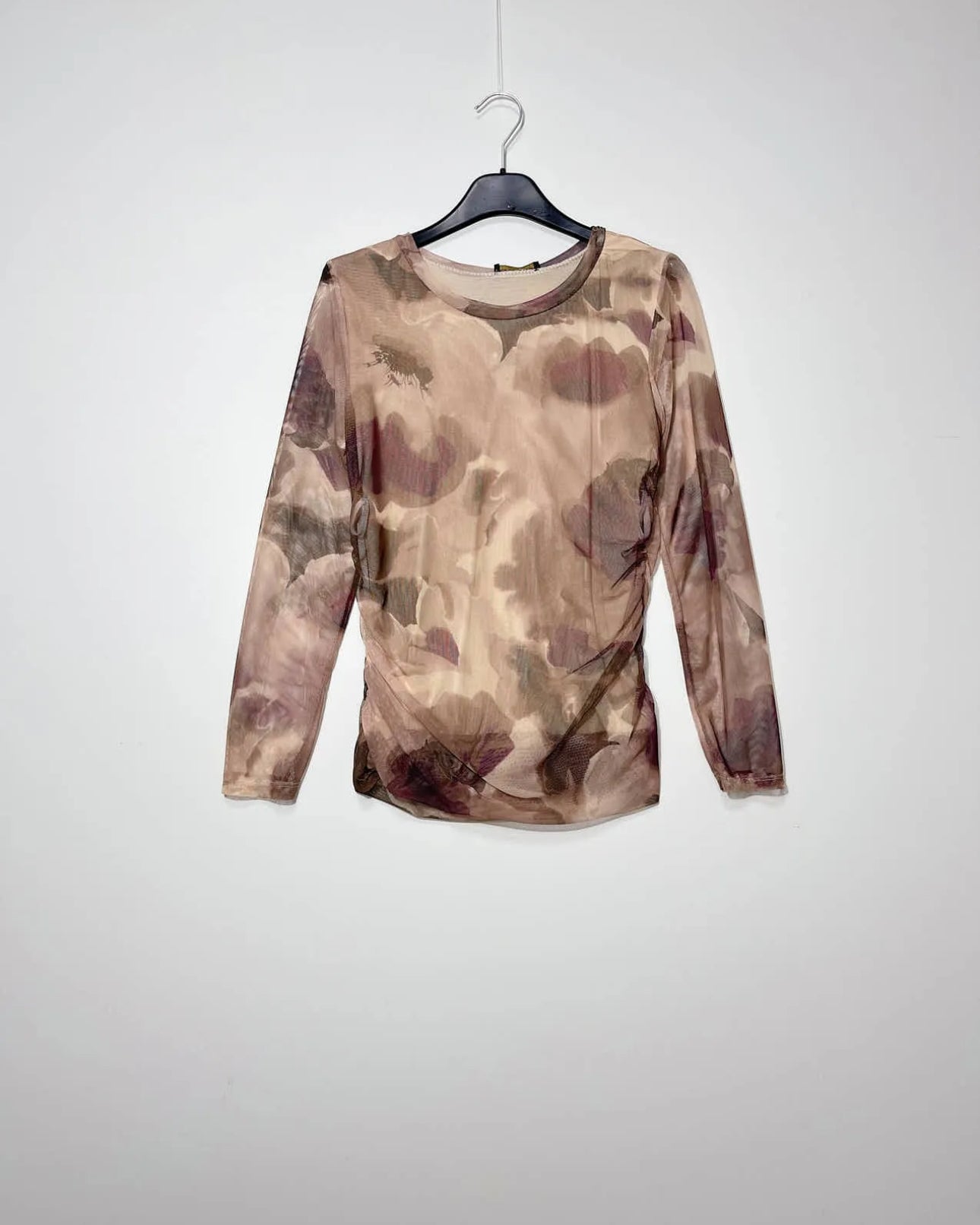 Top in tulle foderato con scollo tondo e drappeggi laterali e fodera in viscosa